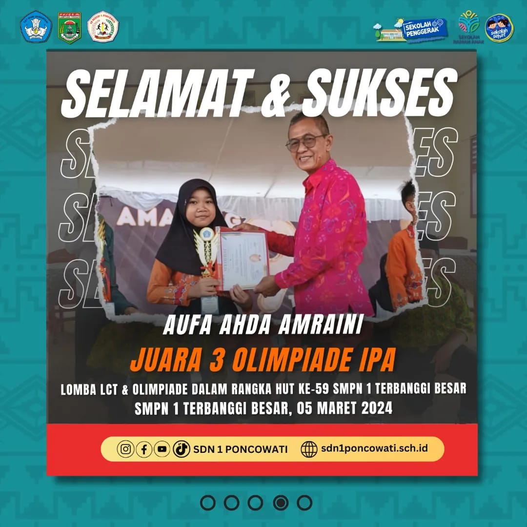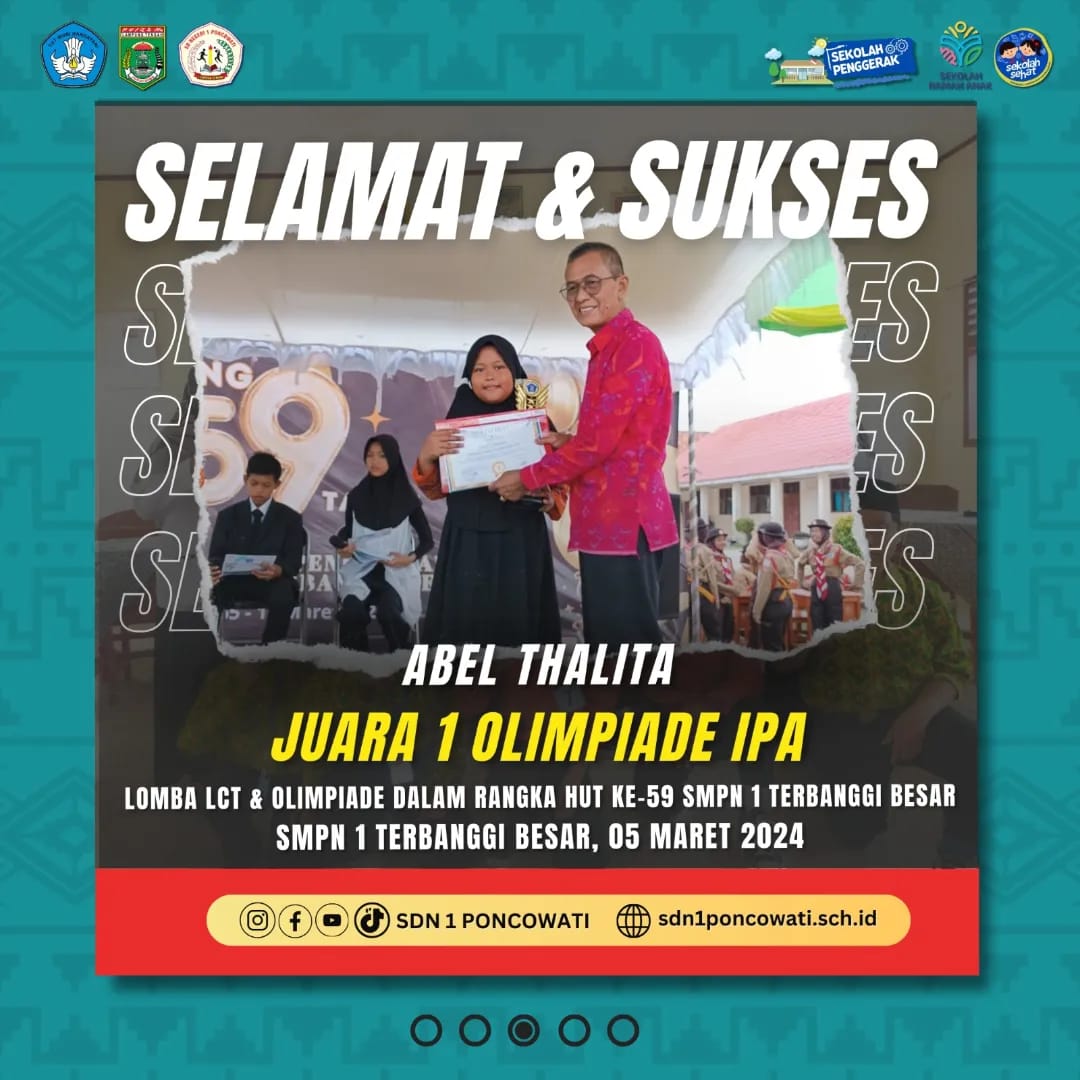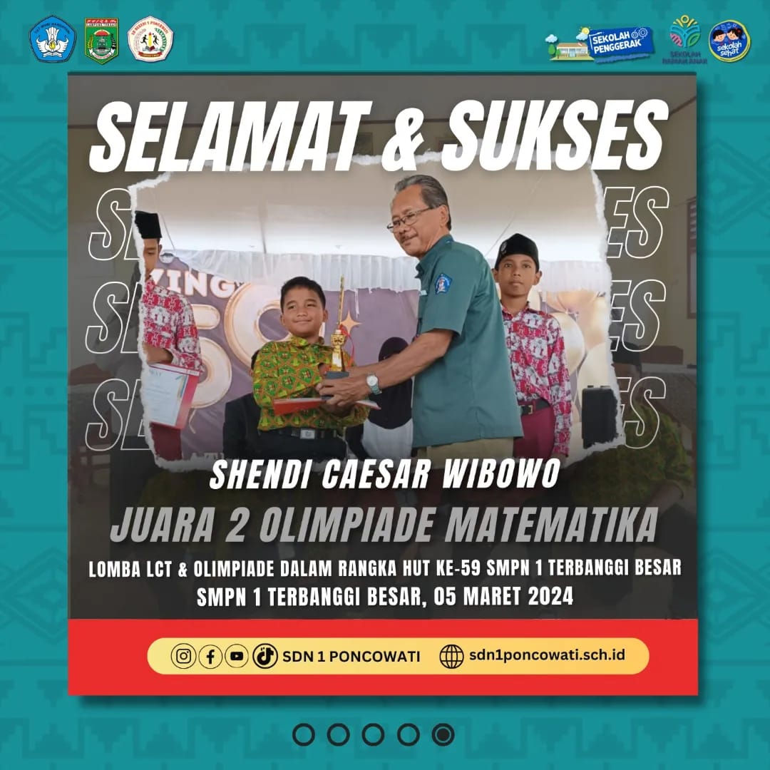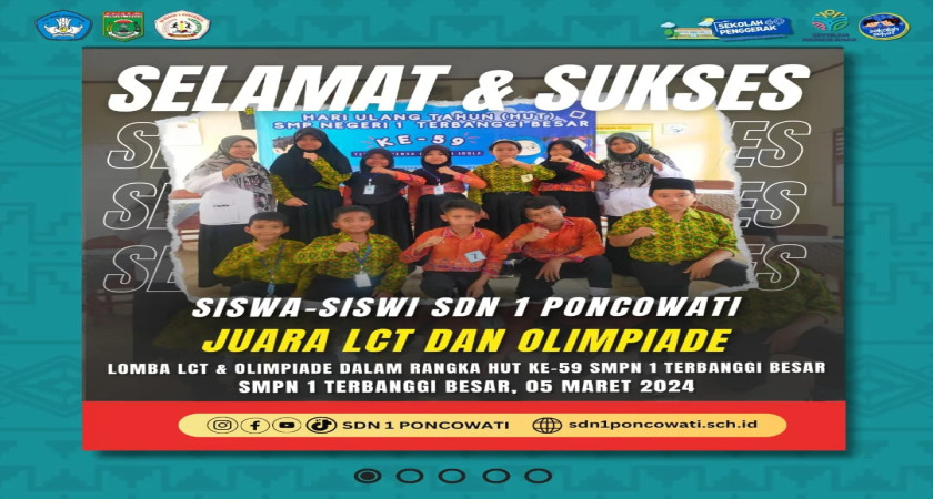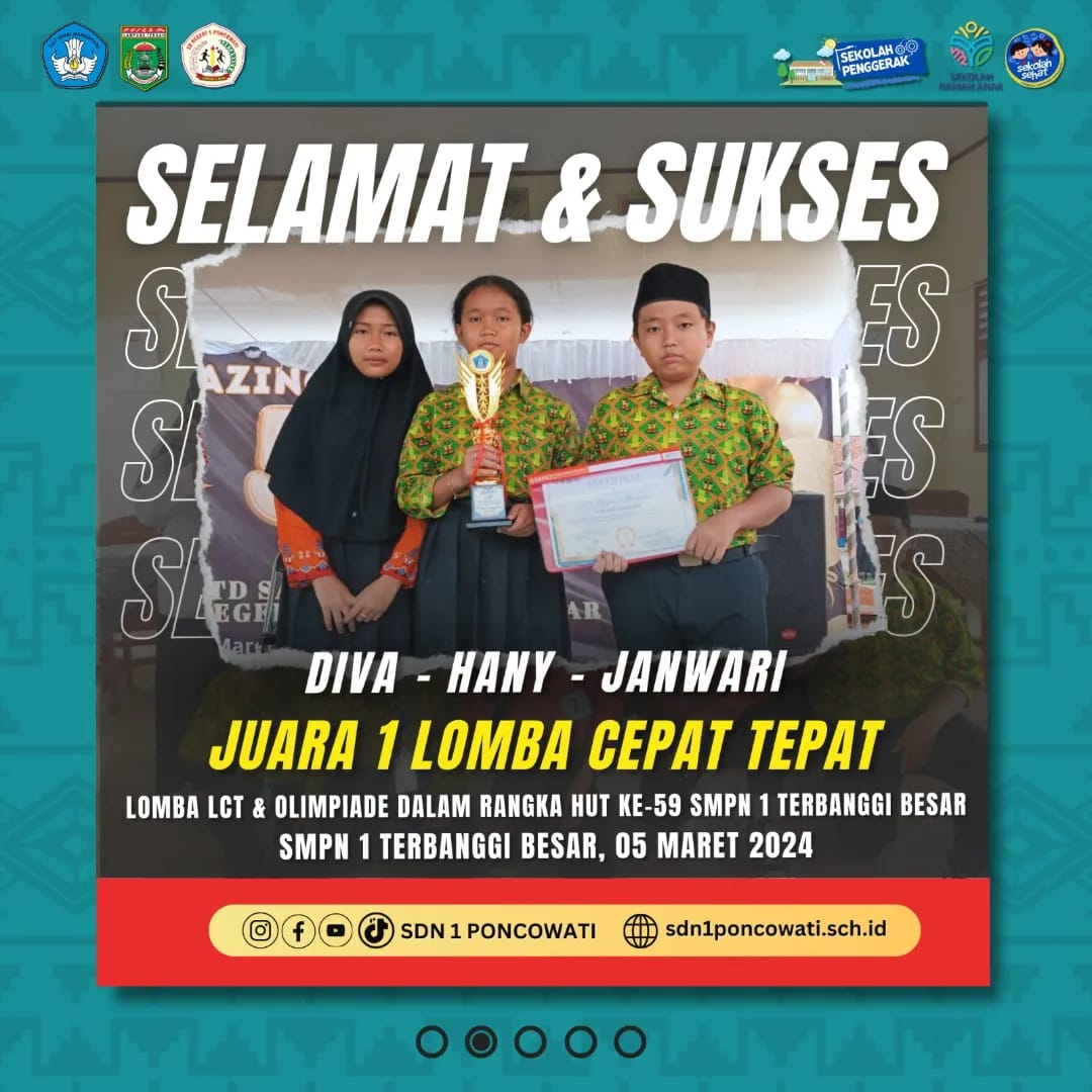 Siswa-siswi SD Negeri 1 Poncowati kembali mengikuti Lomba LCT dan Olimpiade di Acara HUT Ke-59 SMPN 1 Terbanggi Besar pada tanggal 5 Maret 2024, Alhamdulillah Berkat Perjuangan dan Kedisiplinan dalam belajar Siswa-siswi Hebat mampu meraih hasil terbaik dengan di dukung oleh Guru Pendamping yang kompeten, hal ini dibuktikan dengan berhasilnya Siswa-siswi Hebat membawa empat Piala Juara,
