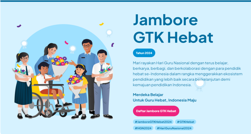 Dalam rangka merayakan hari Guru Nasional 2024 KEMDIKBUDRISTEK Menyelenggarakan Kegiatan Jambore GTK Hebat 2024 yaitu kegiatan yang diselenggarakan oleh Ditjen GTK dalam rangka perayaan besar untuk memperingati Hari Guru Nasional (HGN) sebagai bentuk penghargaan bagi para Guru dan Tenaga kependidikan dari seluruh Indonesia yang telah berinovasi dan berdedikasi dalam peningkatan kualitas pendidikan, serta memberikan penghargaan kepada komunitas belajar inspiratif dalam meningkatkan kompetensi Guru dan Tenaga Kependidikan.