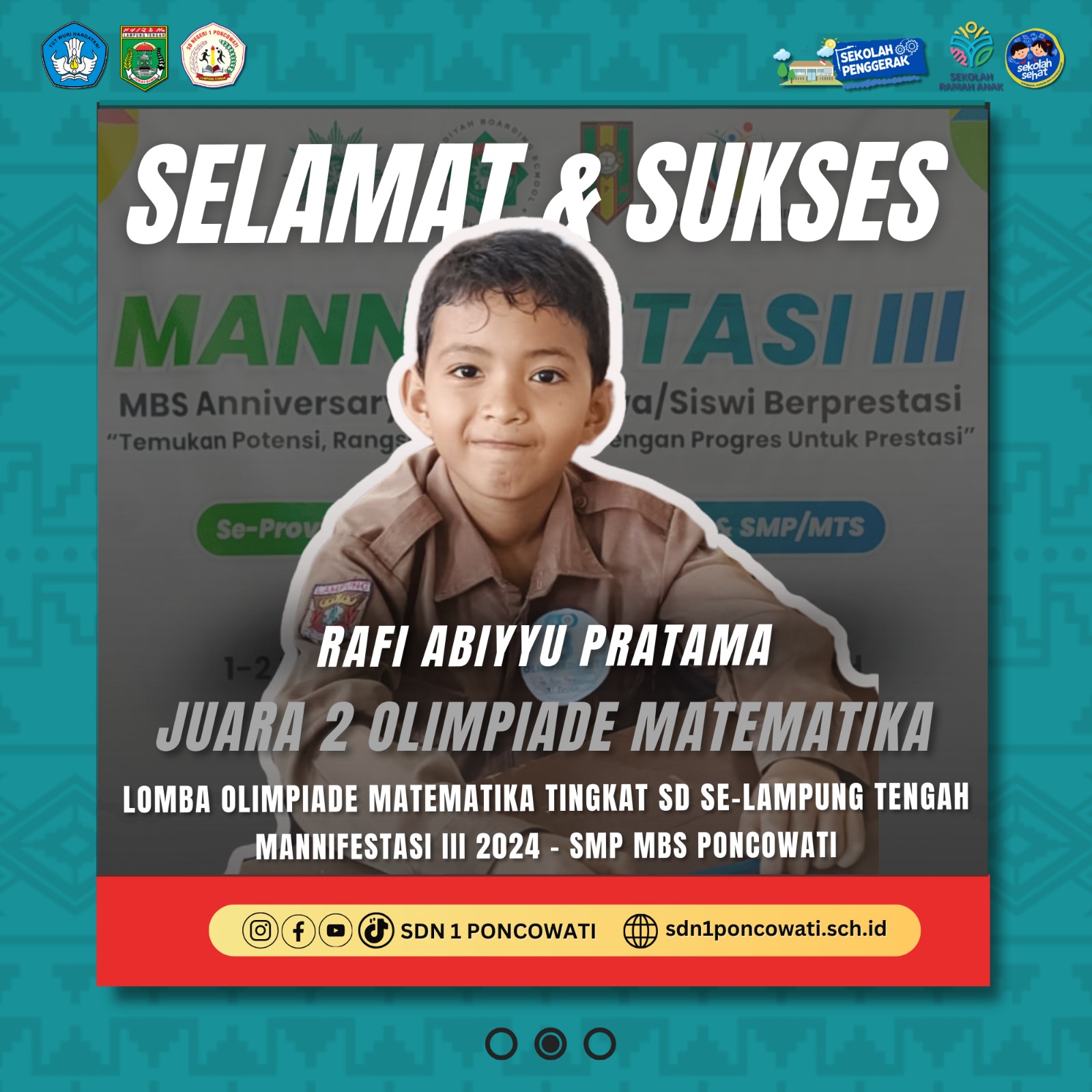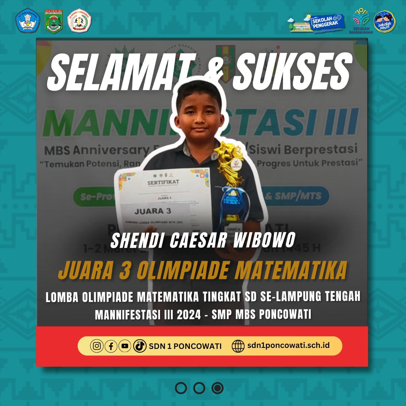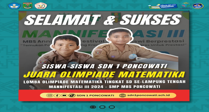 Alhamdulillah pada kegiatan Manifestasi III tersebut Siswa Hebat SD Negeri 1 Poncowati Berhasil Meraih Juara 2 dan 3 Lomba Olimpiade Matematika, berkat Kerja Keras dan keuletan dalam belajar Selamat dan Sukses Kepada ananda :
